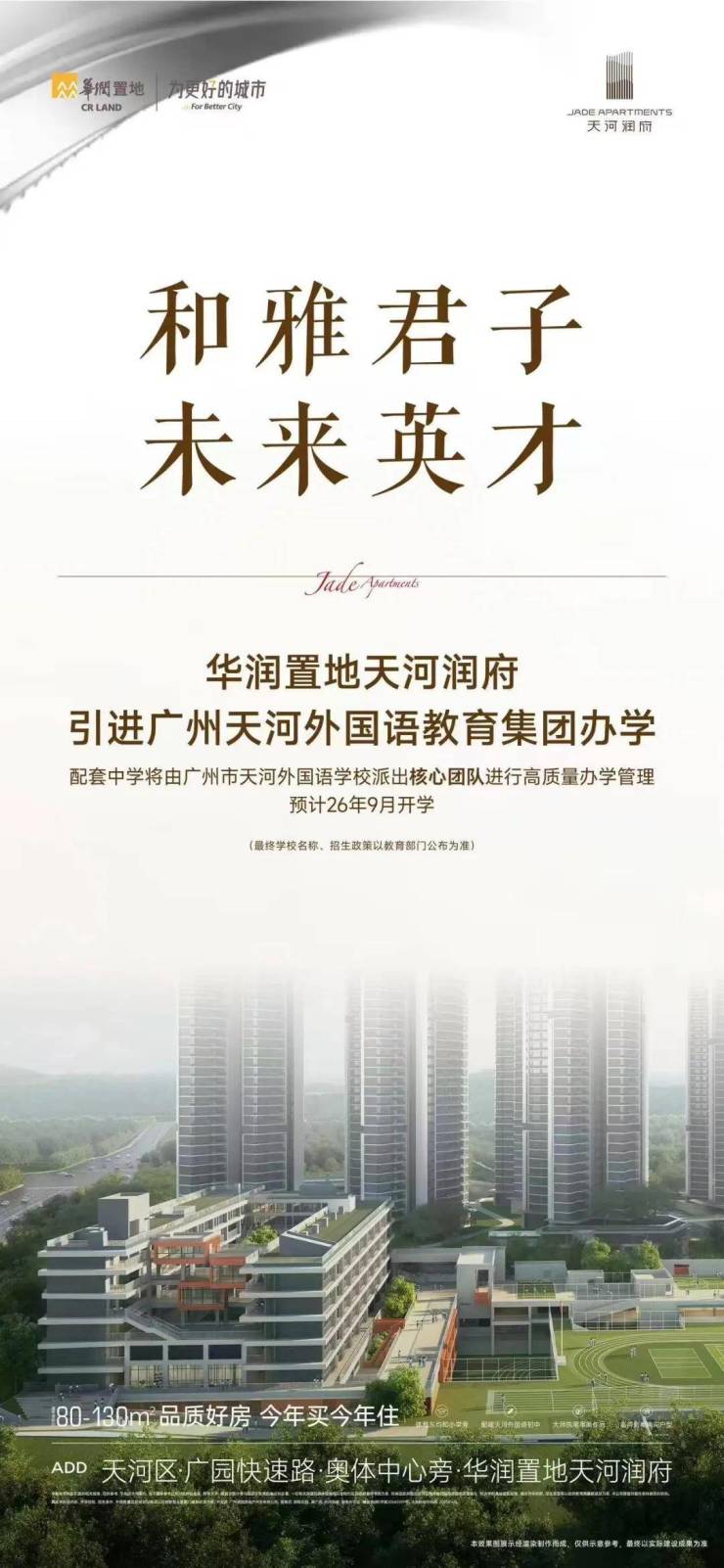 目前,天河润府配建的幼儿园、初中均已封顶。其中,配建初中引进天河外国语教育集团办学,预计于2026年9月开学(具体学校的名称、开学时间、招生条件、开班数量及区域划定等须以政府教育主管部门最新政策为准)。小学则已明确划片入读体育东教育集团均和小学(核心校),首批天河润府业主子女已完成入学报名(详细招生规划,须以政府教育主管部门最新政策为准)。