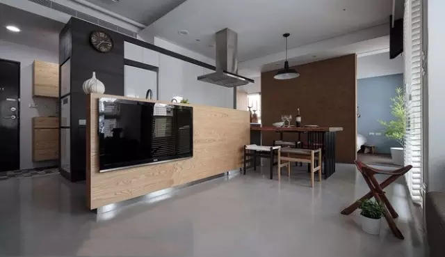 有点现代风,餐桌直接放在开放式厨房旁边,方便随时端饭。