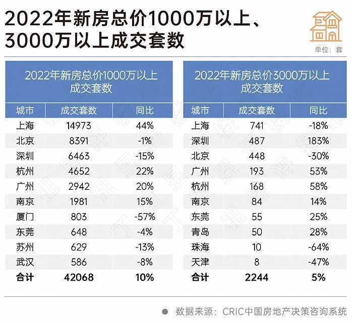作为“终极改善”的千万豪宅,过去一年,核心10城共成交了42068套,同比2021年增加了10%,其中四大一线城市千万豪宅成交占比接近8成。