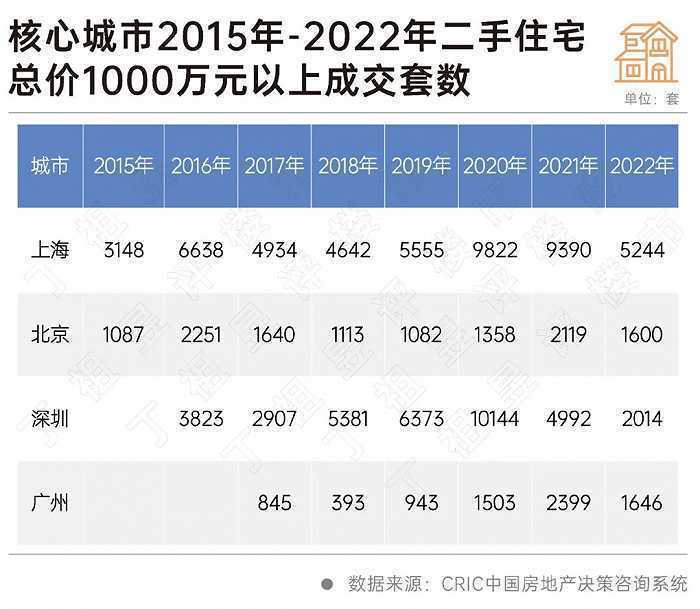 实际上,从更长时间周期来看,核心城市1000万以上二手豪宅成交套数已跌回至2017年,成交规模尚未达到2016年水平。千万以上二手豪宅在2020年达到了峰值,全年成交套数突破2万套,达到了22827套,2021年二手豪宅成交规模较2021年回落了17%,而2022年千万以上豪宅成交套数可谓“腰斩”。
