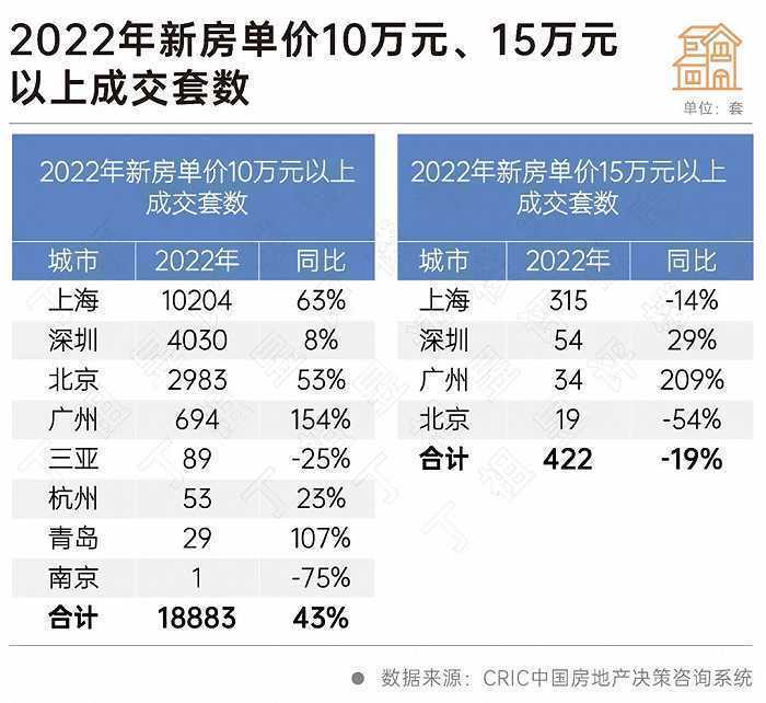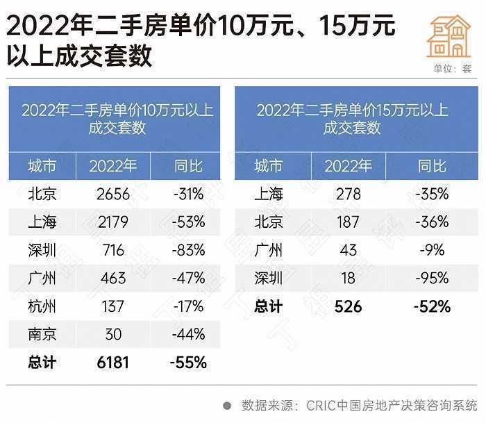单价段也是如此。2022年,单价15万元/平方米以上顶豪共成交422套,同比下降19%。