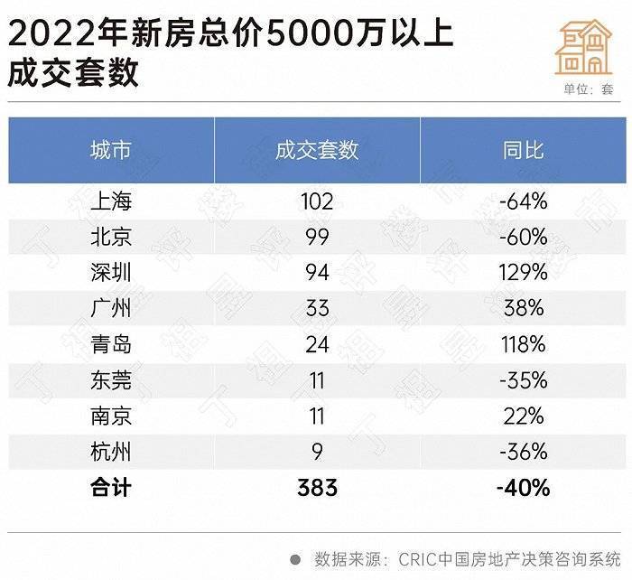 总价5000万元以上顶豪成交出现下行,全年成交套数为383套,同比下降40%。其中,北京和上海成交套数同比下降超6成,深圳和青岛成交套数同比涨幅均在100%以上。