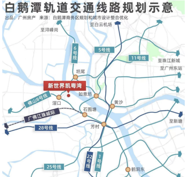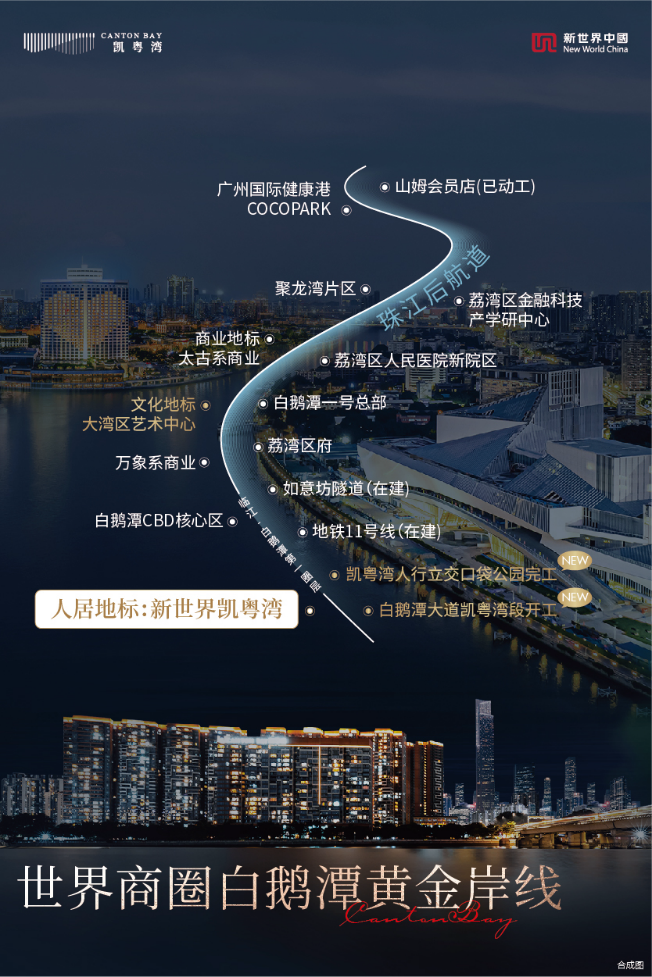 崛起中的世界级商圈白鹅潭,正在成为一个时代的目的地。交通全面铺开:白鹅潭大道、如意坊隧道、地铁11/22号线等项目正加速链合。其中,地图上全新亮相的白鹅潭大道为白鹅潭CBD含金量最高的核心地段,沿路皆城市重要节点与标志性工程,其开通,精确界定白鹅潭第一圈层。人居地标新世界凯粤湾,白鹅潭第一圈层首席高品质大盘,与商业地标太古系与万象城、文化地标白鹅潭大湾区艺术中心集成白鹅潭第一圈层地标圈,鼎立江岸头排,领衔广州下一个十年最具生命力的珠江岸线。