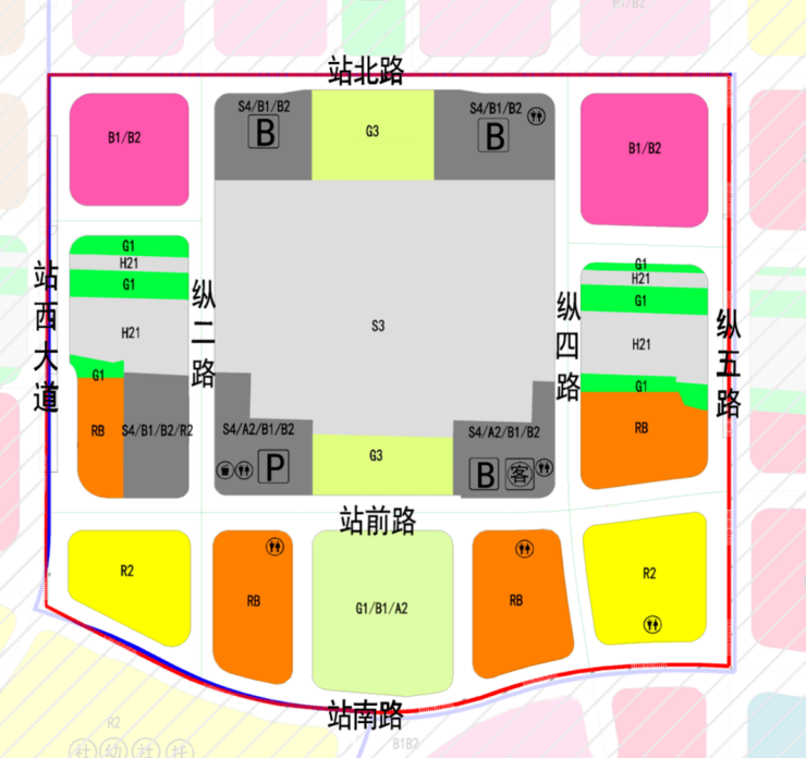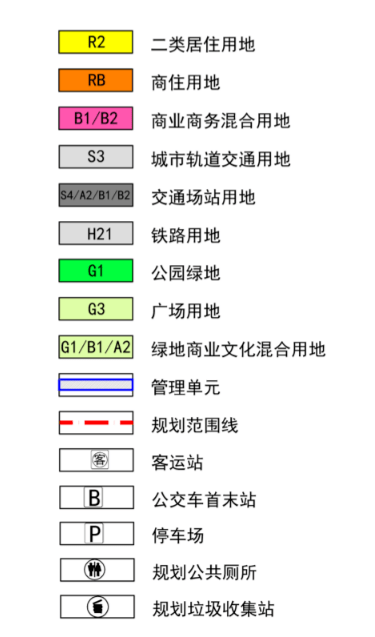 可以看到,区域以火车站为中心,周边围绕着商业商务混合用地、二类居住用地、交通设施用地以及绿地等。