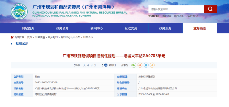 近日,广州市规划和自然资源局公布了增城火车站GA0703单元规划方案的批前公示