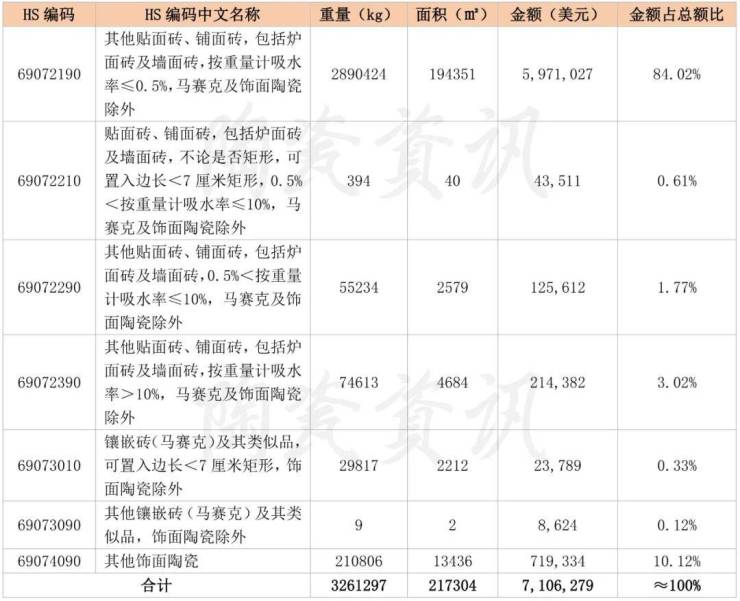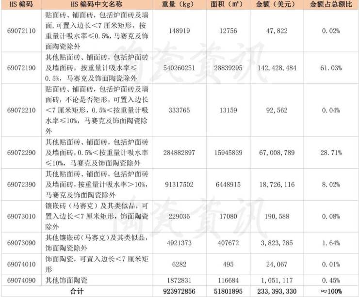 根据上表的统计数据分析,2024年8月,我国出口量最大是HS编码为690722190的陶瓷砖,占出口总额的61.03%;其次是HS编码为69072290占28.71%,HS编码为69072390占出口总额的8.02%。