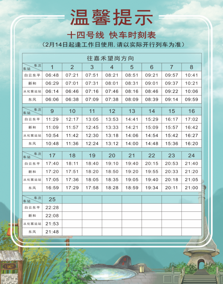 十四号线新的快车时刻表共分为两个版本,分别是2月14日起逢工作日使用,2月12日起逢周六日使用,大家出行时一定要留意日期哦。