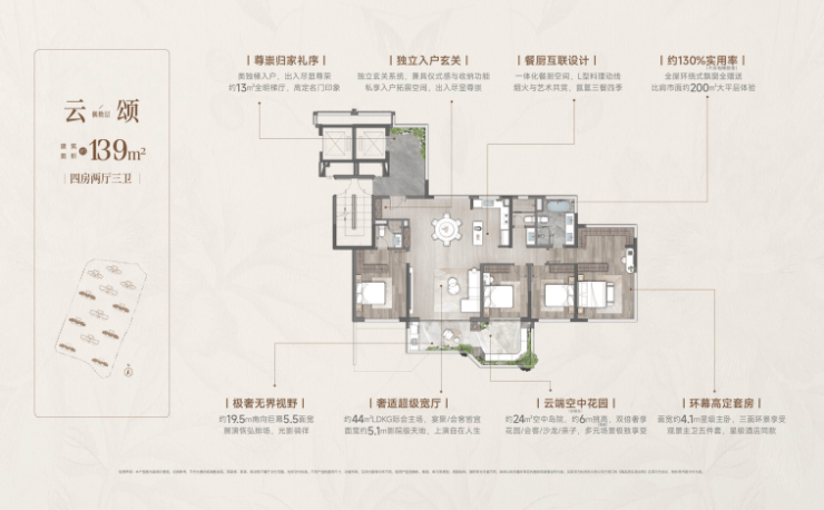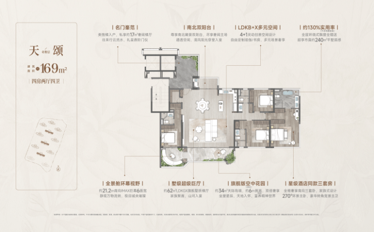 全总统套房配置:建面约169㎡天颂户型,专享3套间奢适配置,主卧套房可媲美五星酒店套房设计,奢逸生活触手可及。