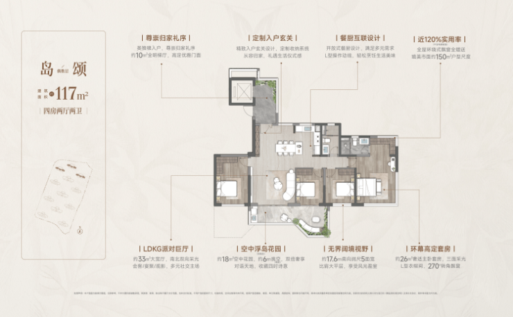 全明方厅布局:首创LDKGX一体化设计,全南向开间布局,搭配270°环幕全景视窗,将天际与园景尽收眼底,让阳光在室内肆意流淌。超大社交场域,会客、家宴、派对等功能均可随心切换。