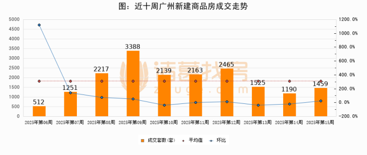 进入2025年第15周(04月07日-04月13日),广州新建商品房成交1459套,较上周增加269套,环比上涨22.6%