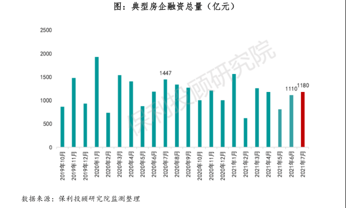 保利投顾研究院监测45家典型上市房企,7月融资总量 1180亿元,较 6 月环比增加 70 亿元,同比下降 18%。随着全面降准实施,资金面边际略有提升,但仍不及去年同期。 从房企融资结构看,7 月境内债券融资总量占比 60%,占比已连续两个月超半成;境外债券占比 24%,银行、信托融资均占比 7%。