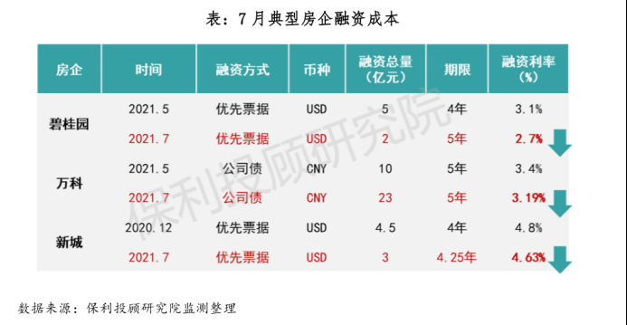 有央企国企资质背书或是行业前十规模的房企如中海、万科、碧桂园、越秀等房企发债利率不到3%,部分信用评级低且杠杆较高的房企发债利率超过10%。监测的典型房企中,7月境内外融资利率均呈现小幅下降趋势,境内融资环境略有松动,境外延续宽松态势,预计后续将保持稳中略降的态势。