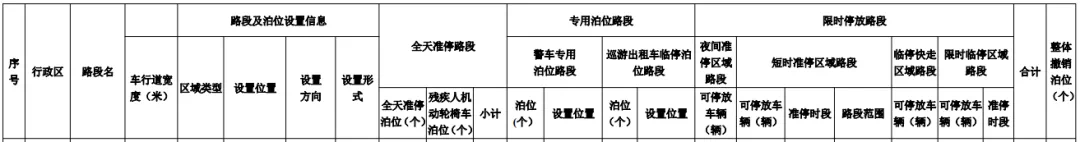 根据《规划》,全市全天准停泊位路段214条、夜间准停区域路段68条、警车专用泊位路段78条、短时准停区域路段23条、临停快走区域路段33条、限时临停路段9条、巡游出租车临停泊位路段30条、整体撤销路段27条。