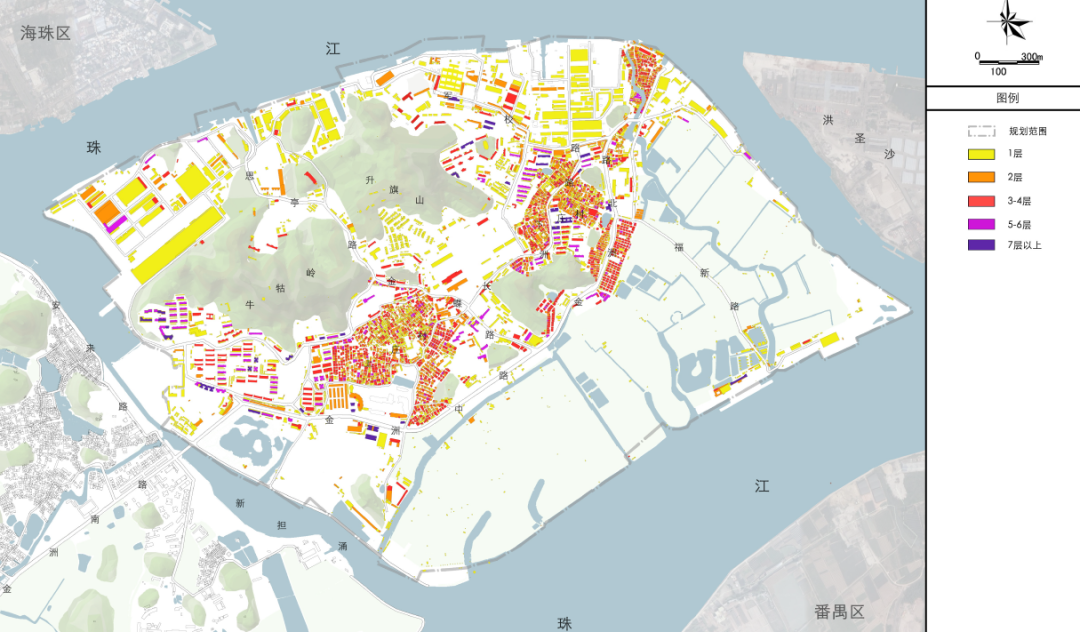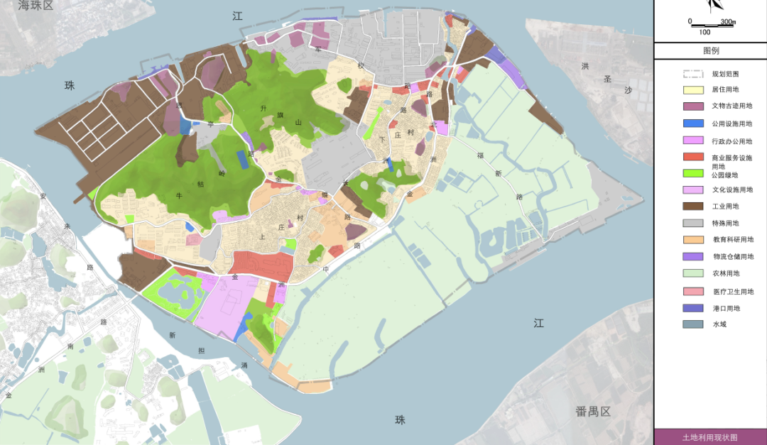 山水环绕:指保护长洲岛南部的湿地果园以及岛上的一号涌、四号涌等河涌水系以及环绕长洲岛的珠江岸线滨水环境。