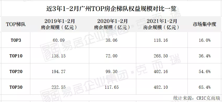 克而瑞统计到,从TOP各梯队表现来看,2021年1-2月广州TOP3房企权益销售金额规模达118.16亿元,同比增长210.5%;TOP10房企销售金额规模达268.5亿元,同比增长272.9%;而TOP20房企权益金额规模为402.16亿元,相比去年同期上涨305%。
