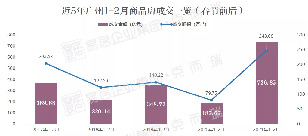 而今年春节前后,乘着去年下半年市场节节走高的东风,1-2月楼市直接冲破天花板;据克而瑞数据统计,2021年1-2月广州商品房网签面积为248.08万方,同比增长211.1%;前2月累计创收达736.85亿元,同比上涨292.6%。
