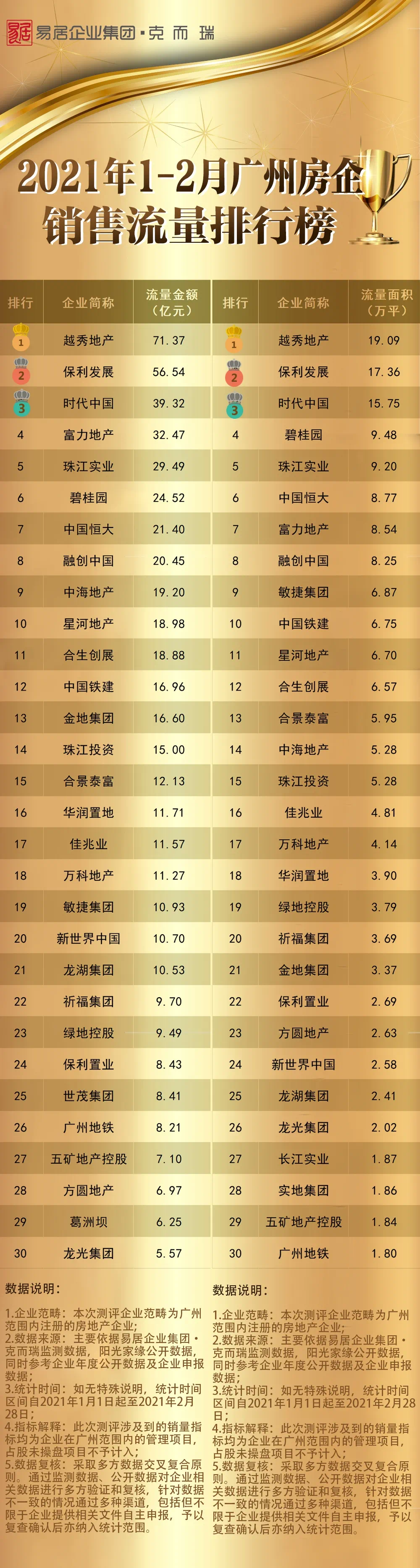 在广州1-2月的房企销售排行榜中,越秀地产,以93.15亿元的全口径金额、56.97亿元的权益金额先进于其他房企;其在流量榜中表现也十分突出,以销售流量金额71.37亿元、销售流量面积19.09万平,斩获流量榜“双榜状元”。