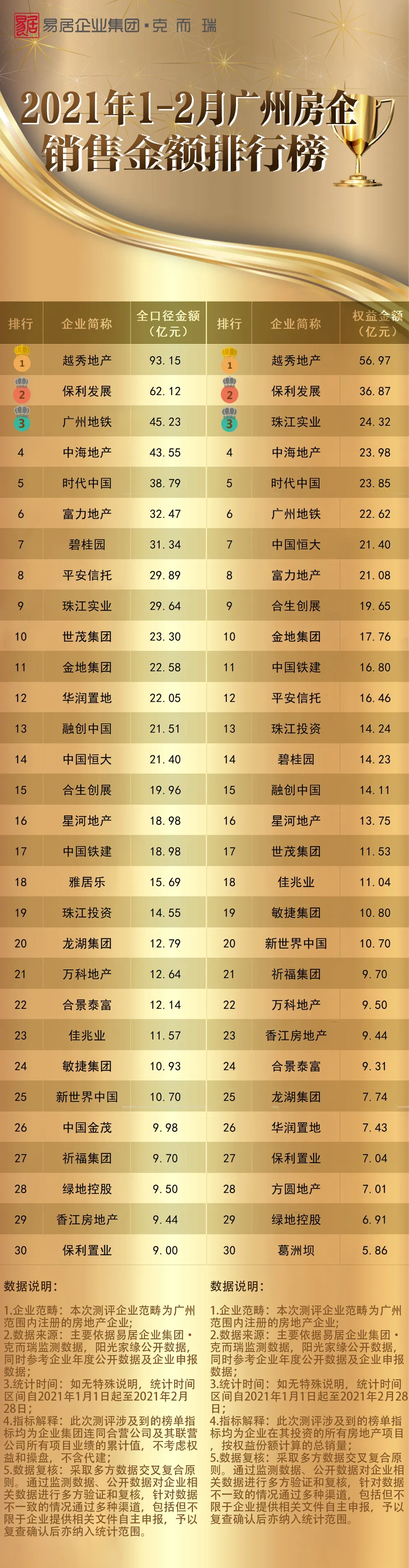 【免责说明】克而瑞所发布的“广州房企榜单”系以易居企业集团·克而瑞监测数据,阳光家缘公开数据为基础,企业年度公开数据及申报信息内容为补充,利用克而瑞第三方测评机构的行业优势和专业立场,通过多维度数据监测、多元化综合评判所生成的房企销售排行榜,为尽可能避免公开数据和监测数据的失真,实现信息核实之目的,对于未自主申报数据的部分企业,视情况不纳入榜单。克而瑞明确表示,上述榜单内容为独立见解仅供参考,克而瑞不对使用上述榜单及其内容所引发的任何直接或间接损失承担责任,且就榜单相关内容享有全部的解释权。
