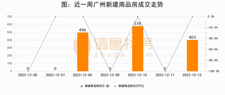 根据广州市住房和城乡建设局数据显示,2023年12月12日广州新建商品房成交403套,较昨日增加403套,环比上涨0%