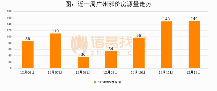 根据诸葛找房数据显示,广州24小时涨价房源量为149套,较12月11日增加1套,环比上涨0.7%。与此同时,涨价房源占比小幅扩大,业主信心有所提升。
