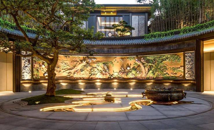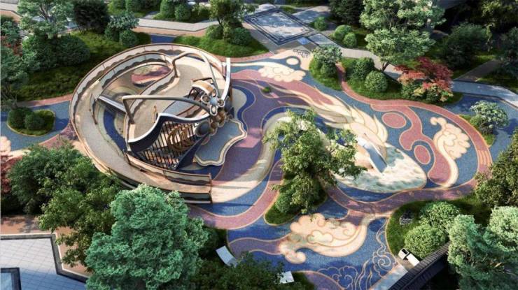 先看看今年最先交付的珠海悦玺。斥资重金打造面宽约40米的百万级双王府大门,罗汉松、照壁、地雕等点缀左右,高门阔府气派立显。苏韵盎然的园林里,不仅有源自《清明上河图》的虹桥以及从江南移植的名贵植物和奇石,还有清代名家沈铨《百鸟朝凤图卷》作为装饰,园林整体造价更是高达约1200万。