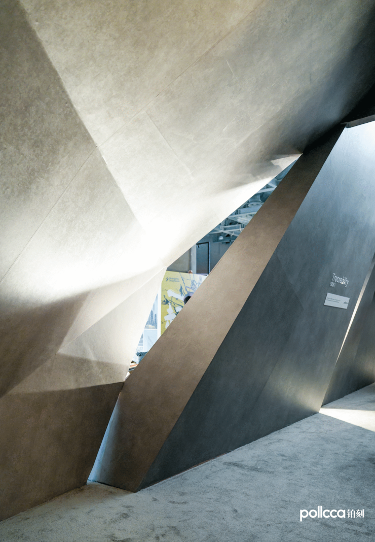 设计师将抽象表现主义大师杰克逊·波洛克的绘画语言转译为建筑语言,以简洁硬朗的线条勾勒岩石般的不规则几何体,使得展馆宛如从大地岩层拔地而起,体块穿插堆叠、高低错落,诠释pollcca 铂刻平衡繁与简的美学张力。