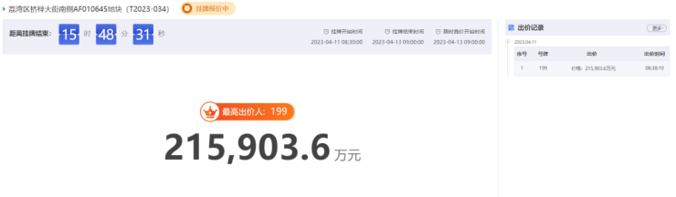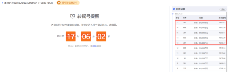 而就在今日(4月12日)15:50,番禺区迎宾路地块的争抢突然激烈了起来,一下子冲到了最高限制地价,并转入了摇号环节。