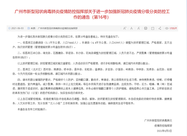 6月3日,广州市人民政府官方网站发布广州市新型冠状病毒肺炎疫情防控指挥部关于进一步加强新冠肺炎疫情分级分类防控工作的通告(第16号)。全文如下: