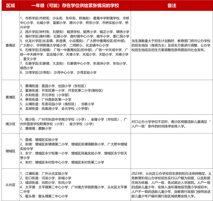 值得一提的是,尽管近年来,广州11区发布学位预警信息已成常态。但往年的预警名单中大多都是小学,而今年多个区的预警名单中却还提到了中学,如白云区广州培英中学初中部、番禺区侨兴中学、广大附中番禺校区(初中部)。