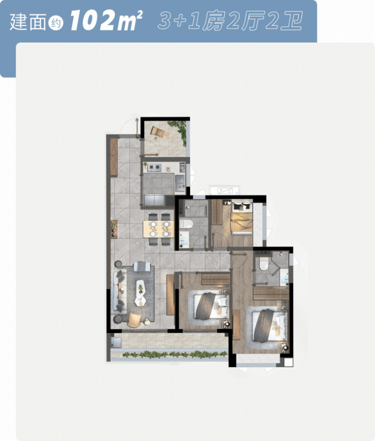建面约102㎡的3+1房,经典竖厅设计,动静分区,三开间采光。