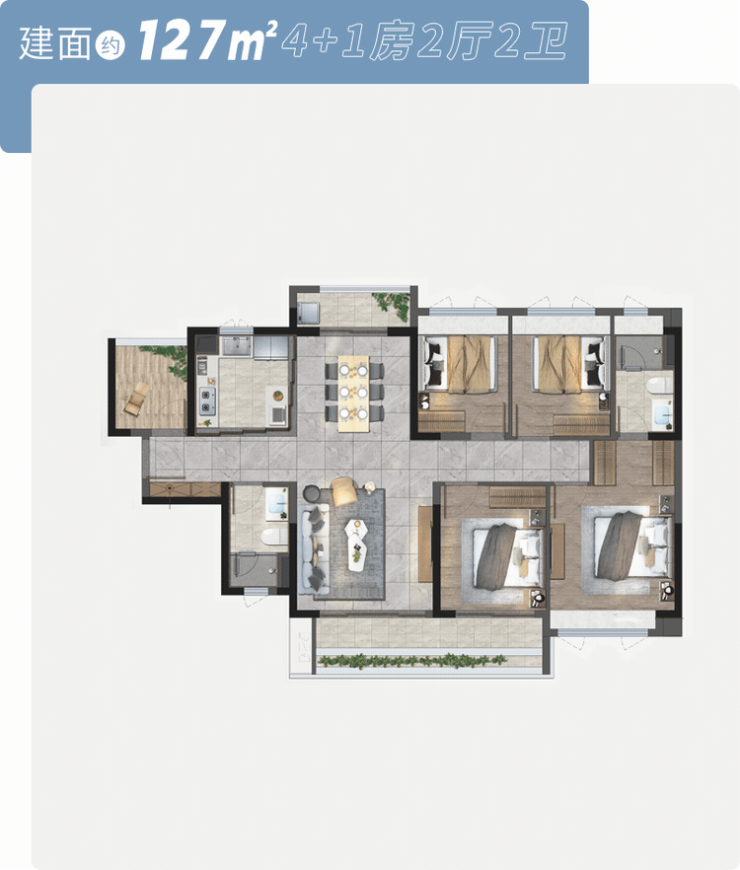建面约127㎡的4+1房,更显功力之深厚,面积少了14平,但同样做到4+1房。