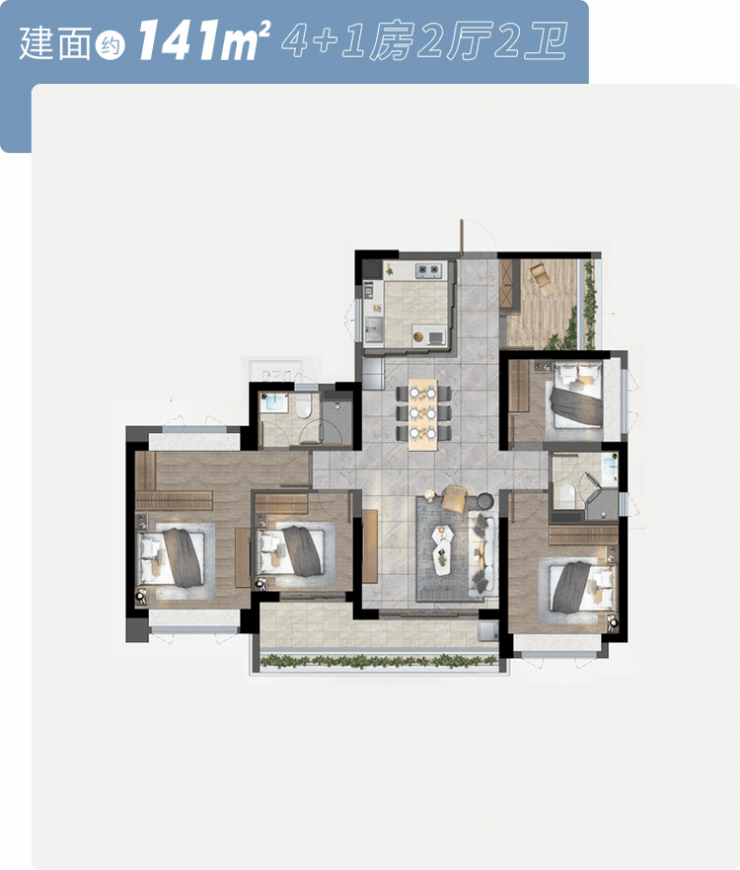 建面约141㎡的4+1房,面积不超豪宅线,又能有豪宅的享受,将平衡二字演绎得炉火纯青。