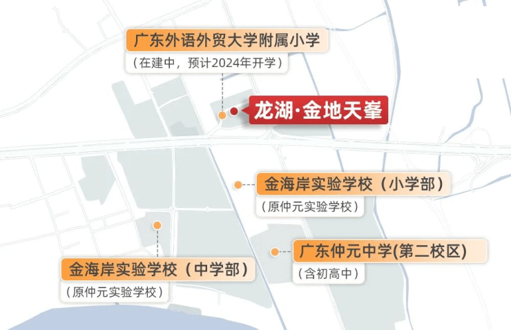 龙湖·金地天峯周边1平方公里内,竟集聚了广外附小、金海岸实验学校(原仲元实验学校)、广东仲元中学第二校区3大名校。(注:具体招生政策,一当年教育地段划分为准)