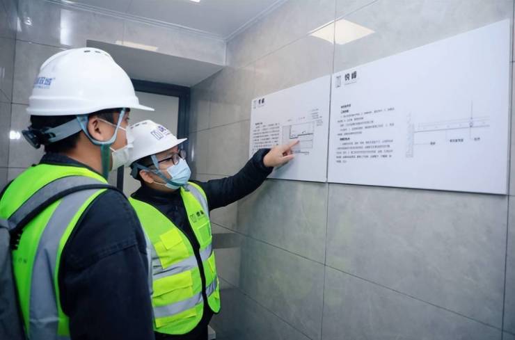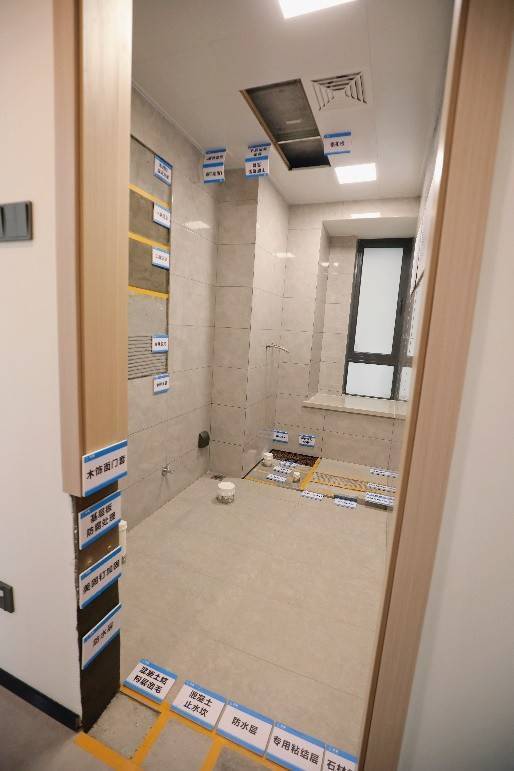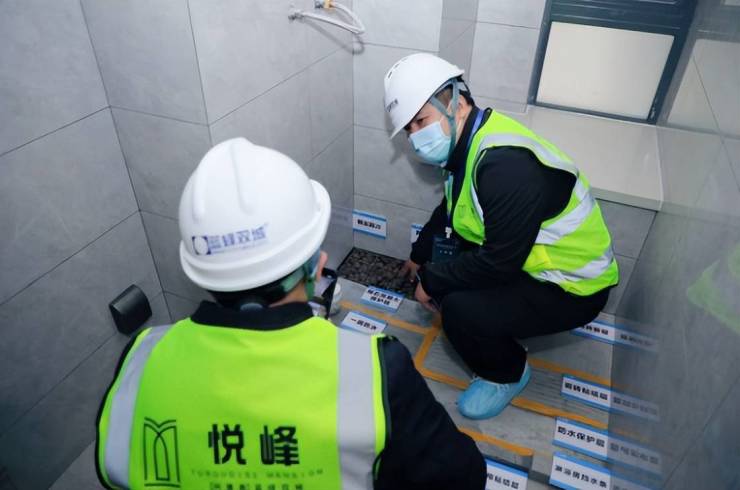 当然,此次工地开放活动最值得报道的还是项目工艺工法的展示。根据工程师的介绍,悦峰项目本次开放的实体工艺板房里呈现了诸如“阳台地面铺贴工艺、外墙涂料工艺、卫生间挡水坎工艺“等十种工艺。从每一种工艺的工序流程,到每一遍施工的细节标准,都体现出了蓝绿双城的高标准施工体系。