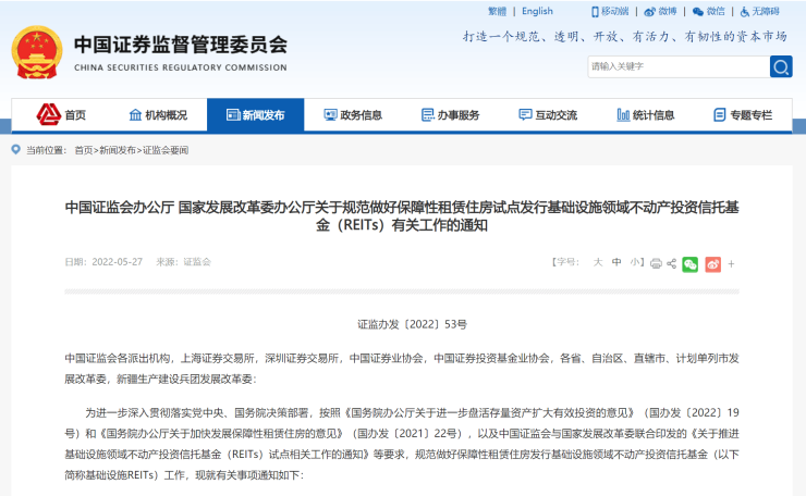 5月27日,中国证监会办公厅、国家发改委办公厅发布《关于规范做好保障性租赁住房发行基础设施领域不动产投资信托基金(REITs)试点有关工作的通知》,主要内容包括认识保障性租赁住房发行REITs的意义、落实房地产市场平稳健康发展要求、规范回收资金用途、压实参与方监督职责、加强沟通协作等。