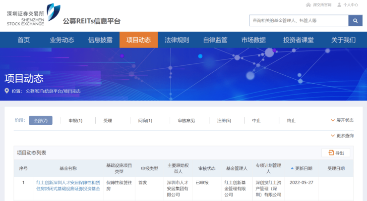 5月27日,据深交所公募REITs信息平台披露,“红土创新深圳人才安居保障性租赁住房封闭式基础设施证券投资基金”(简称深圳人才安居REITs)项目申请材料已通过深交所基础设施公募REITs审核业务系统正式申报,并于同日向中国证监会申报。