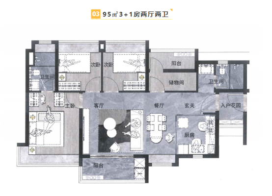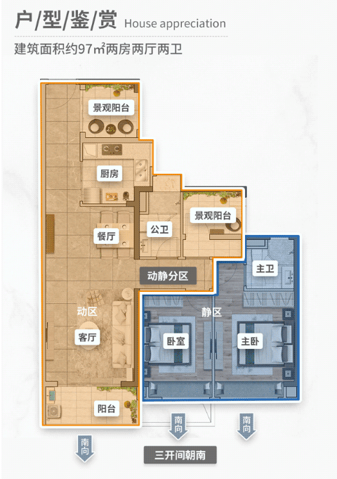 128平4房2厅2卫户型,南北对流、经典竖厅设计、拥270°南向景观阳台、全屋飘窗赠送、主卧套房设计,还有步入式衣帽间,尽享尊贵体验。