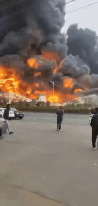 一栋建筑物内大面积起火,甚至将屋顶烧穿,火苗直接飚上天,远看像一辆着火的列车。