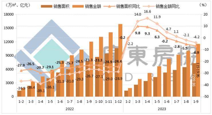 9月份,随着个人购房首付“认房不认贷”、降低首套和二套住房首付比例和贷款利率等住房信贷政策的出台实施,加之房企积极促销,销售量有所回升:商品房销售面积835.31万平方米,其中商品住宅630.25万平方米,同比下降16.5%和21.7%,降幅比8月收窄9.4个和10.1个百分点;环比增长40.1%和40.8%,反映出政策优化成效初显。