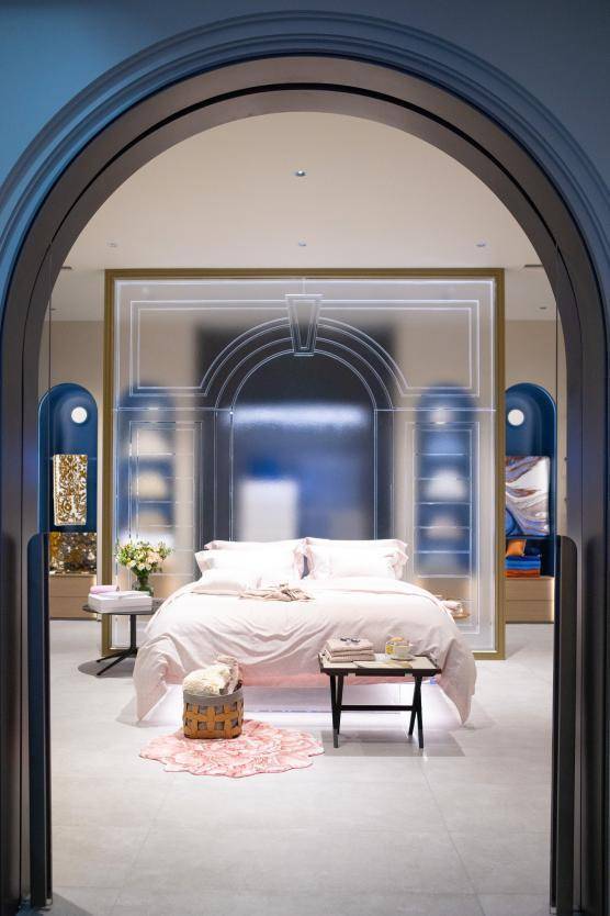 用心选择的高奢品牌家具在分割不同空间的同时,也引导着来宾的观赏动线。拥有彩虹色彩的柔软毛浴巾巾精心放置于展示面板中,遥相呼应;床品以色系和风格有序陈列,各类地垫错落有致,不同系列的产品叠放出惊艳效果。