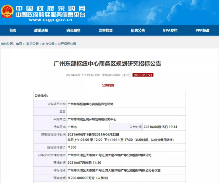近日,中国政府采购网公布广州东部枢纽中心商务区规划研究招标公告。