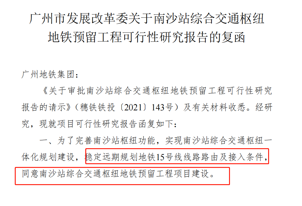 来源:南沙站综合交通枢纽地铁预留工程可行性研究报告的复函