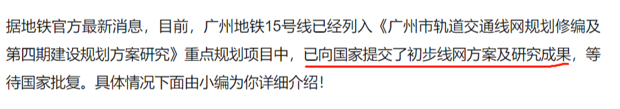 那么地铁15号线现在是什么进度呢?上一年有消息称广州地铁15号线已经列入《广州市轨道交通线网规划修编及第四期建设规划方案研究》重点规划项目中,已向国家提交了初步线网方案及研究成果,等待国家批复。