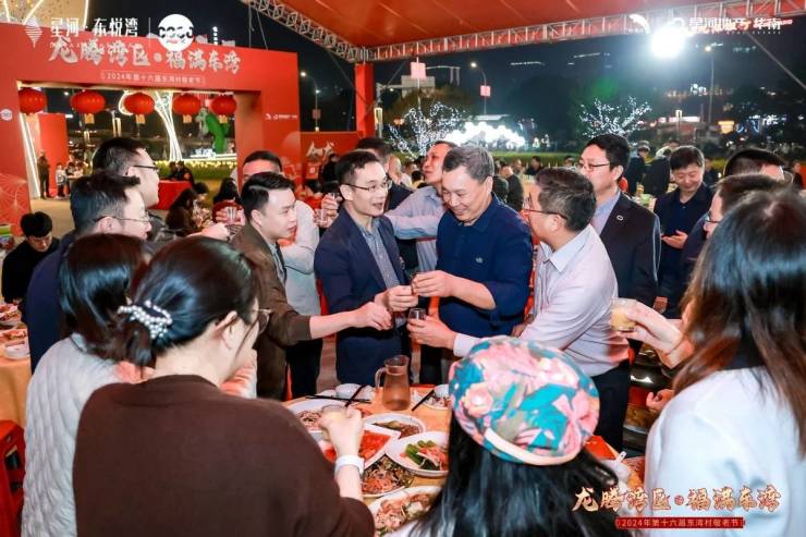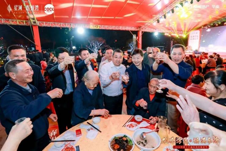 晚宴祝酒环节,领导来宾们一起上台,向东湾的父老乡亲们表示感谢及祝福,星河控股集团董事长黄楚龙先生发表祝酒词时讲道:“星河将敬老爱老进行到底,全力建设更好的东湾,星河有能力有信心,为东湾的父老乡亲们带来更好的生活”。
