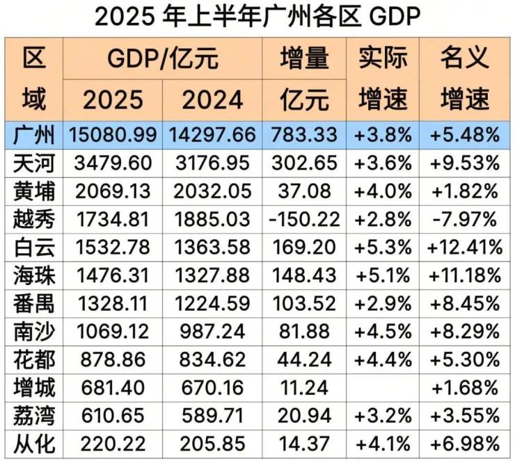 日前,广州统计局公布了十一区GDP运行情况: