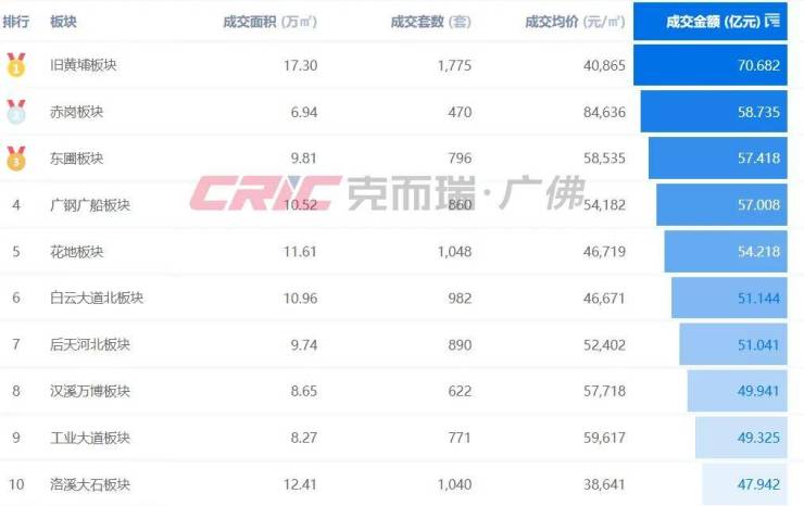 克而瑞数据监测显示,旧黄埔板块今年1-7月商品住宅成交面积17.3万㎡,位列全市成交面积板块TOP2,成交金额70.68亿元,登顶板块TOP1。