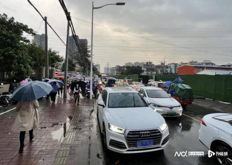 2月13日傍晚17时许,广州突降大雨,让本就车流密集的龙溪中路更加拥堵。沿路还有两所中小学正处于放学时间,不少家长把私家车、电动车停靠在路边等待小孩,一旦有货车、公交车等大型车辆会车,就需要其中一侧停下让行,跟随的车辆也不得不减缓车速。