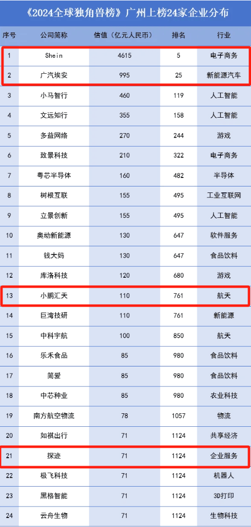 上榜的24家广州企业中,除了希音、埃安还有另外两家来自番禺的企业——小鹏汇天、探迹(分列第13、第21)