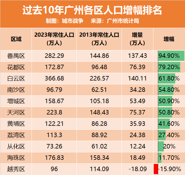 4月1日,广州统计局官方公众号发布了2023年广州的人口数据。数据显示,2023年末广州常住人口1882.70万人。过去10年番禺区的人口增长最猛增幅达到94.9%,排名全市第一!