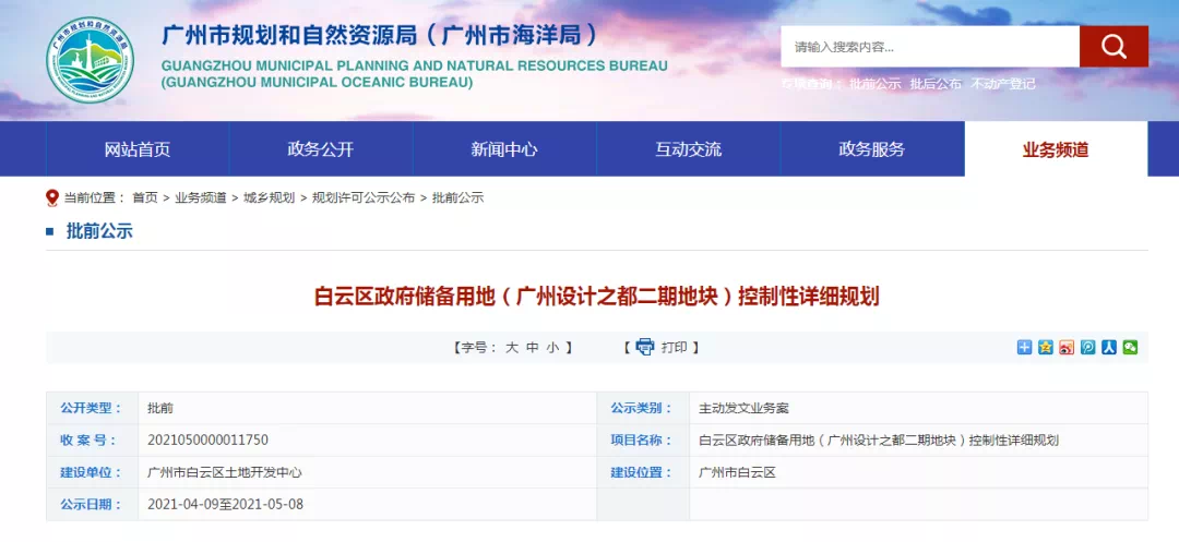 4月9日,广州市规划和自然资源局发布《白云区政府储备用地(广州设计之都二期地块)控制性详细规划》批前公示。